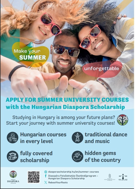 We are happy to inform you that the summer university courses of the Hungarian Diaspora Scholarship for 2026 are now available for the Hungarian diaspora community. Applicants with a Hungarian background have the chance to visit Hungary and to participate in inspiring short-term courses and community activities with the Hungarian Diaspora Scholarship in the summer of 2026. The opportunity will allow them to gain experiences and impressions of our country and awaken their interest in a longer-term period of study in Hungary.
